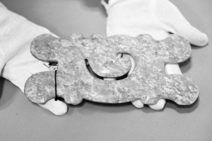 工作人员向记者展示追回的文物——红山文化勾云形玉佩
