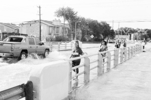 5月26日,在美国得克萨斯州休斯敦,人们从河水漫溢的桥上经过。