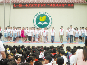 本报讯 “六一”儿童节前夕,周口七一路一小全体师生欢聚一堂,举行了文化艺术节之“班级风采秀”活动,目的是为了展示班集体积极、 乐观、 向上的形象, 增强班级凝聚力和号召力,加强各班级间的交流。