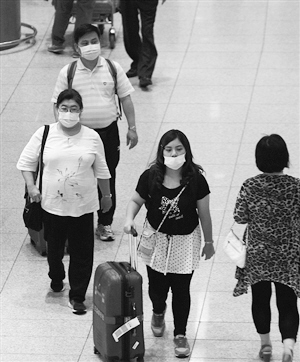 韩国机场乘客纷纷戴起口罩加强防范。