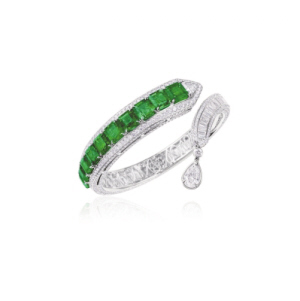 OpusII,No.5,EllingtonBangle爵士琴键祖母绿手镯以浪漫的钢琴爵士蓝调为灵感,10颗近15.80克拉的顶级祖母绿,搭配三角形切割白钻与圆形明亮式白钻,衬托于白金之上,经典BaguetteCut白钻与梨形白钻点缀。共计26.57克拉。
