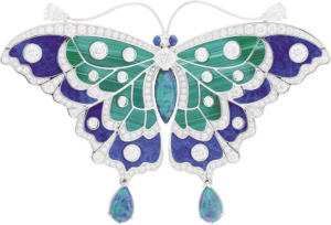 Papillons蝴蝶高级珠宝系列Noire蝴蝶胸针白K金,钻石,孔雀石,青金石,黑色欧珀。自1920年代起,这些拥有纤纤羽翼的美丽生物便化身为珍贵的胸针与耳环,成就了百年世家款款传世之作。