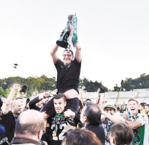 当地时间5月31日,里斯本竞技队球员庆祝夺冠。当日,2014—2015赛季葡萄牙杯决赛在里斯本大区内的国家体育场结束,里斯本竞技队在90分钟内以2∶2战平布拉加队,并在点球大战中以3∶1击败对手,夺得球队史上第16个葡萄牙杯冠军。