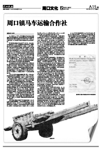从1949年马车运输萌芽到1956年合作社成立,再到1975年退出历史舞台,在长达30多年的时间里,周口镇马车运输合作社在周口民间运输史上写下了辉煌一页。遗憾的是,由于历史沿革等原因,1965年之前的资料不能查及,之后的资料少之甚少,只能从这些残缺的资料中看到他们当年的影子。50年后的今天,我们借助发黄的档案资料,再次聚焦他们时,那些吃苦能干的马车夫,立下功劳的“汗马”,悠悠转动的马车,热火朝天的马车运输场景,顿时在脑海里生动起来。