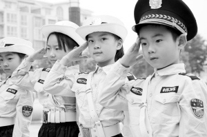 6月1日,“小交警”在河南省武陟县公安局交警大队民警的指导下练习敬礼姿势。
