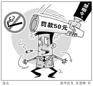 被称为“最严禁烟令”的《北京市控制吸烟条例》6月1日实施。北京卫生监督所6月2日介绍,6月1日执法人员劝阻违法吸烟55人次,处罚个人违法吸烟行为1起,罚款50元,这是“禁烟令”实施后针对个人的首张罚单。 新华社发 朱慧卿 作