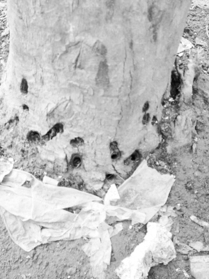 6月2日,记者在现场看到,这棵行道树位于市儿童医院大门西侧,枯黄的叶子和周围树木绿油油的树叶形成很大反差。这棵树的树干部分没有什么异常,只是根部有近20个洞,这些洞直径多为两三厘米(下图),并且比较深。