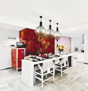 餐厅的设计也延续了变化的手法。内装蜡烛形灯泡的“大灯笼”,配上棕色的酸枝木墙面,本就透着古韵。但设计师仍不满意,要给这面墙挂上些精致的装饰物,它们的原型是惠安女的帽子。由于房子地处泉州,设计师想将当地的惠安女文化也融入进来。