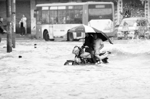 6月3日,在贵州安顺城区,一辆摩托车被困在积水中。
