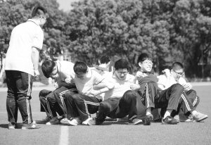 6月3日,河北省张家口市宣化一中的高三学生在做“原地背起”游戏,释放压力。