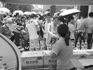 昨天上午,在周口三高考点门前,4.5元一瓶的“恒大冰泉”在考点门前免费发放,颇受考生欢迎。许多考生入场前,都特意来到供应点前领一瓶“恒大冰泉”。据介绍,6月7日当天,该公司仅在周口三高一个考点门前,就发放了100多箱“恒大冰泉”。