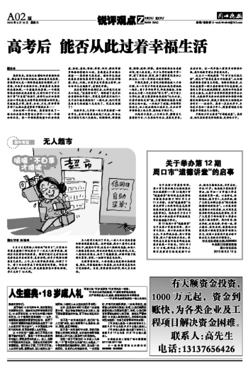 高考结束。收起大红横幅和身份验证设备,揭去编号和指示标记,搬回原来的桌椅,考场霎时又是一间间普通教室的模样;出了考场,不论多么惴惴不安,多数高考生都会很快意识到,一个最悠长的暑假、一个漫漫苦海后的狂欢就在眼前;父母们终于可以不再盯紧“不自觉”的孩子,老师们也不必再因为担心学生轻生而将学校封闭得如同牢笼;交通恢复正常,教育、公安、卫生、消防等许多部门也都从高度紧张中解脱出来……