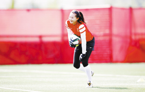 当地时间6月10日,中国队守门员张越在训练中。当日,中国女足在加拿大埃德蒙顿的克莱尔训练场进行赛前训练,备战将于6月11日进行的2015加拿大女足世界杯小组赛A组对阵荷兰队的比赛。