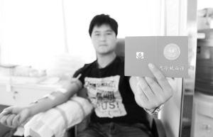 6月14日,一名参加无偿献血的河北保定市民在展示他的无偿献血证。当日是世界献血者日,全国多地开展主题活动,向市民普及无偿献血的意义,并号召市民无偿献血、奉献爱心。新华社记者 朱旭东 摄