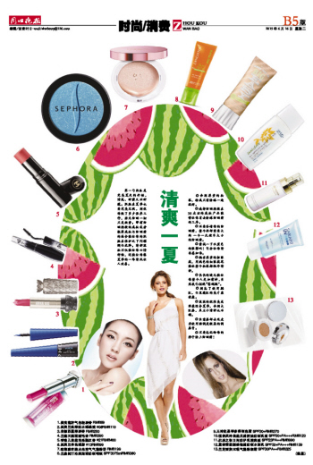 第一勺西瓜是完美夏天的开始,清爽、甜蜜又不甜腻。肌肤在夏季也要完美无瑕,别说你做了多少保养工作,若无防晒一切只是徒劳。带有防晒指数的底妆或者轻薄底妆与防晒霜的结合能让你的肌肤在保护之下闪耀润白光泽。清新淡妆不仅能让你心情舒畅,还能让你像夏季的一阵清风让人欢喜。