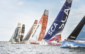 6月14日,中国东风队(右三)在港内赛中。当日,2014—2015赛季沃尔沃环球帆船赛在法国航海名镇洛里昂举行了第九赛段港内赛,中国东风队获得季军。该赛事的本赛季第九个、也是最后一个赛段将自洛里昂出发,预计在27日抵达终点瑞典哥德堡。中国东风队目前在七支船队的总排名中列第三位,与暂时积分领先的阿布扎比队相差10分。新华社发