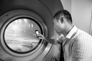 6月16日,白鹤梁水下博物馆水下参观廊道内,游客在用手机透过玻璃拍摄。