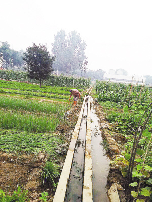 除了多数农民使用上述的漫灌方式外,在周口市区七一路办事处康湾社区的一片菜田里,另一种较为原始的水沟浇灌方式仍然存在。在这里,菜农用砖和水泥修建了一条35厘米宽,并且可以连接起每家地头的小水沟,看上去就像棋盘网格一样,相互交织、四通八达。