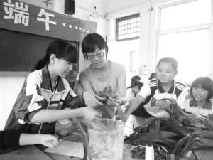 将两片粽叶重叠在一起,左右折叠,把粽叶握在手里形成锥状,往里填满糯米、蜜枣等馅料,再将粽叶折叠起来,用线捆扎好,一个胀鼓鼓的绿粽就成型了。6月17日下午,周口第十八初级中学的30多名中学生用学包粽子的形式庆祝端午节的到来。据悉,该校通过举办中学生学包粽子活动,不仅丰富了学生们的生活,更让他们感受到祖国传统节日的文化魅力。晚报记者 张志新 摄