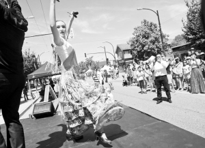 6月21日, 在加拿大温哥华, 民众在封闭后的行车道上观看舞蹈表演。