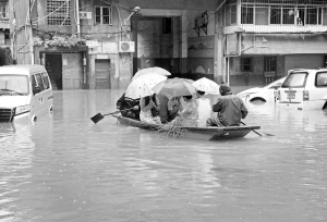 6月22日,在南昌市新建县国税局住宅小区,工作人员用船将小区内居民转移。