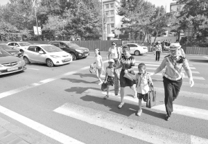 6月23日,长春交警“女子助学岗”的执勤女交警护送学生和家长过马路。