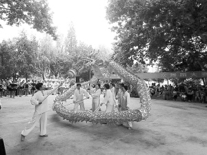 在铿锵有力的锣鼓声中,一条彩色巨龙腾空而起,追逐着宝珠,忽而龙头高耸似冲云霄,忽而低头如入海破浪,看得人眼花缭乱,情绪激昂,更让人惊讶的是,舞大龙的竟是一群平均年龄超过60岁的老人(如图)。这些老人是女娲艺术团队员,他们的精湛技艺,让人确信“高手在民间”这句话真的很有道理。近日,记者采访了女娲艺术团部分队员,感受到他们热爱生活、浑身充满正能量的美好心态。