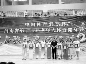 6月18日,河南省第十二届老年人体育健身大会健身秧歌交流活动在三门峡市陕县体育馆落下帷幕,周口代表队摘得规定动作和自选动作双优秀奖。图为颁奖后队员合影。晚报记者 李伟 通讯员 刘月平 摄