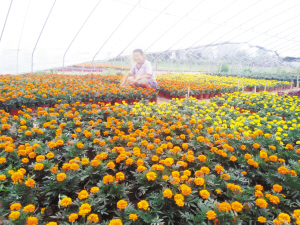 附近赵和平的和平花园也是花香四溢。赵和平外出到广州进货了,他的爱人任玉英和儿子赵艳彬在给花卉浇水培土。说话间,花园里来了几位客户,他们精心挑选,把几盆漂亮的盆景搬进车里。赵艳彬说,他家的花卉销售到阜阳、亳州、驻马店等地。“俺村的位置好,临近213省道,目前花卉种植已经形成了一定规模,市场前景一定会很好的。”赵艳彬自豪地说。谈起经济效益,赵艳彬只是笑答:“反正挣的钱够花不就行了。”
