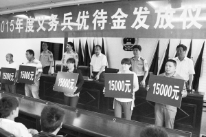 据悉,2015年义务兵优待金标准较去年有所提高,农村义务兵优待金不低于当地上年度农民人均纯收入;城镇义务兵优待金不低于上年底城镇单位在岗职工最低工资标准。涨幅从9.9%到11.8%不等,平均涨幅11.4%,即农村义务兵优待金每人每年10615元,城镇义务兵优待金每人每年15000元。