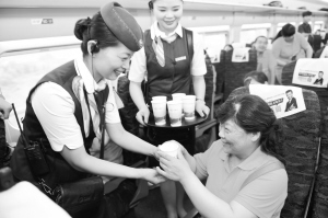 6月28日,高铁乘务员为环卫工人提供茶水。当日,备受关注的合福高铁正式开通,从合肥到皖南地区车程极大缩短。应安徽省宣城市绩溪县龙川景区邀请,合肥市包河区100名一线环卫工人免费乘坐合福高铁来到龙川景区游览,参观徽派古民居、品尝正宗徽菜、感受社会对他们的尊重和敬意。新华社记者 杜宇 摄