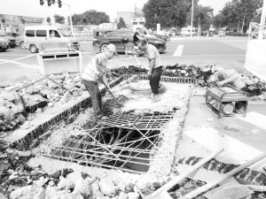 7月2日上午,记者再次来到现场,看到三四名工人正在紧张施工,下沉、开裂的路面已被挖开(如图)。记者目测需要维修的路面有十多平方米。“表层路面清理掉后,下一步就就是用钢筋加固,然后再浇灌混凝土。”一名施工人员说,“这段路面以前加固的钢筋有点儿少,很难承受车辆长时间碾压。”
