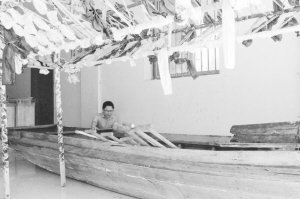 7月2日,在市博物馆文物库房,记者见到了这艘翎船(如图),船身前窄后宽,呈雁尾状,最吸引人眼球的是翎船上搭建的长3.3米、宽1.1米的彩色牌坊。彩色牌坊顶为歇山式双层四面挑檐,上用彩色绸缎束花镶嵌,檐角下绣球悬挂,看上去色彩斑斓,非常漂亮。