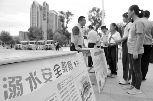 7月5日,工作人员对学生们进行防溺水安全教育。当日,宁夏回族自治区教育厅联合多部门在银川市开展暑期学生防溺水专项宣传活动。参加活动的学生们通过观看警示教育短片、阅读安全防范宣传材料和学习各类溺水救援设备的使用方法提高暑期安全意识,加强对溺水的防范。新华社记者 彭昭之 摄