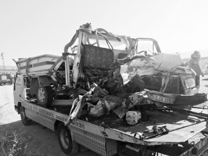 7月6日,救援人员在土耳其西部马尼萨省的车祸现场拖走一辆损毁的汽车。