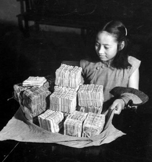 6.据此,由上海引发的金融狂潮迅速向整个国统区蔓延,先是天津、南京等各大城市,人们大量抢购黄金美钞,如痴如狂,继而镇江、嘉兴、淮安等中小城市也纷纷效仿。图为1945年,中国小女孩拿厚厚的几摞钞票买东西。