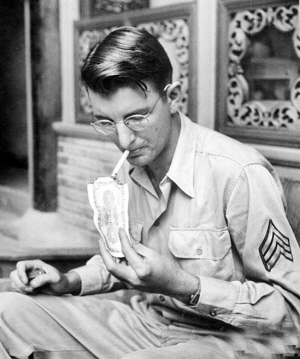 3.民国末期,通货膨胀,货币贬值,经常听说“拿着一口袋钱买不到一口袋米”,可是对于现在的我们很难想象当时的情景。这张图就展示了抗战结束后国民政府统治下通货膨胀的奇景。 图为1945年,驻中国的美国大兵用钞票点烟。