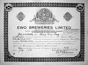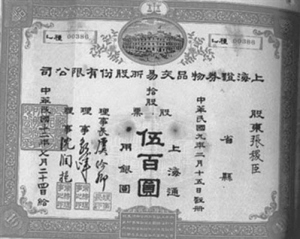 2.到1947年,上市股票增加到32只。然而,因为国民党统治下通货恶性膨胀,导致经济全面崩溃,股票市场也不能独善其身,经历短暂繁荣后,开始迅速衰退,之后一系列行政政策,更是导致股票价格全面暴跌。图为上海证券交易所于1923年发行的股票。