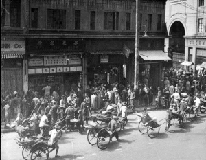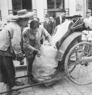 5.法币币值惨跌带动了其他民生必需品价格上扬,日用洋货普遍上涨1倍,米价腾升。到1945年2月8日,上海物价指数是战前的1.2万倍。图为1945年,民众把一麻袋的钱放到黄包车上。