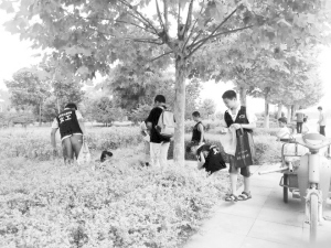 7月8日上午,在学校老师的带领下,十多名身穿红色上衣的小“义工”提着塑料袋,冒着酷暑,在周口公园捡纸屑、烟头等垃圾,清洁环境,争当家园守护者,引来游玩市民啧啧称赞。