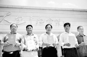 7月8日,几名小岗村农民展示领到的《农村土地承包经营权证》。