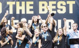 当地时间7月7日,美国女足成员与现场庆祝。当日,刚刚获得女子足球世界杯冠军的美国队参加了在加州洛杉矶斯台普斯中心外举行的公众庆祝集会。新华社发