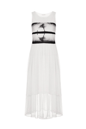 白色图案连衣裙 无论小清新还是淑女范,都不可能少了一款女生连衣裙。洁白的无袖款为夏日增添清凉,轻巧面料营造层次感裙身,黑白图案以倒影效果呈现恬静迷离的优雅。