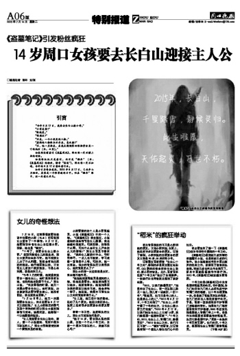 “2015,让我们静候灵归”、“如果你去了长白山,请一定在那儿驻足一会儿,那儿有一场离别,一别十年”、“张起灵,他不仅是书上的人,还是我心上的人”、“2015年8月17日,十年之约到了”、“长白山,小哥守候了十年的地方,让长白山接小哥之行走起”、“2015年8月17日,让我们站在长白山上大喊‘小哥,我们陪吴邪一起接你回家’”、“十年之约,2015,长白山上,青铜门内,静候灵归” 、“2015长白山之约,我们不见不散”……“稻米”的留言,让记者感受到一个虚拟人物在他们心中的地位。