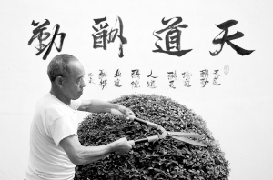 7月13日,在河南嵩县田湖镇小安头村,一位村民在文化墙旁修剪植物。