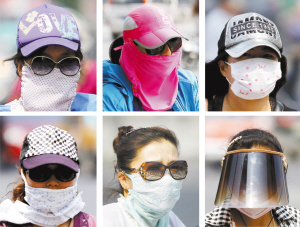 7月13日,市民出行时“全副武装”遮阳防晒(拼版照片)。