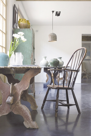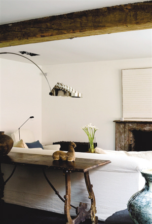 四白落地的墙仿佛是一块画布,那些古董家具就是画布上最美丽的勾勒。屋顶还保留着农场老房子的横梁,白色的布艺沙发衬托着古董桌和复古的壁炉。桌子上摆放的陶罐和装饰都散发出年代感,一盏大大的金属落地灯,古典和现代这一刻完美融合。