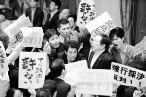 经过累计110多个小时的审议,众议院和平安全法制特别委员会当天就安倍政府提交的安保法案进行总结性答辩。在主要反对党代表质询结束后,执政的自民党和公明党控制的特别委员会不顾在野党强烈反对进行表决,并通过了安保法案。众多反对党议员在会场打出“反对强行表决”、“打倒安倍政治”、“自民党真差劲”等标语,抗议执政党无视民意强行表决“战争法案”。