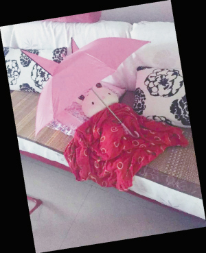 外面下着雨,女儿在屋里给玩具兔子打着伞睡觉。你的世界,爸爸不懂了。