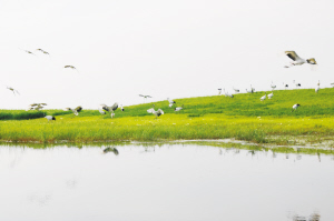登上望鹤楼极目远眺,只见鹤和各类水禽,集群嬉游,翱翔盘旋,令人心旷神怡。这北国的江南,正是芦苇青青,草地翠绿,野花飘香的初夏时节。远方洁白如帆形的观赏亭,让你恨不得一步跨到它的面前,好近距离地观赏到美丽纯洁的丹顶鹤。